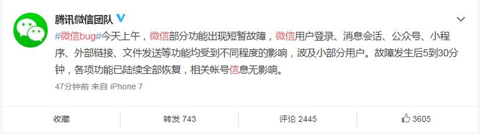 今天上午12点左右,腾讯微信团队在微博上回应:#微信bug#今天上午,微信部分功能出现短暂故障,微信用户登录、消息会话、公众号、小程序、外部链接、文件发送等功能均受到不同程度的影响,波及小部分用户。故障发生后5到30分钟,各项功能已陆续恢复,相关账号信息无影响。
