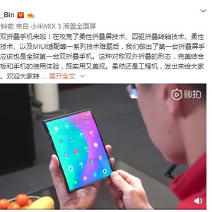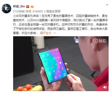 1月23日,小米总裁林斌发微博表示,在攻克了柔性折叠屏技术、四驱折叠转轴技术、柔性盖板技术、以及MIUI适配等一系列技术难题后,小米做出了第一台折叠屏手机,应该也是全球第一台双折叠手机。