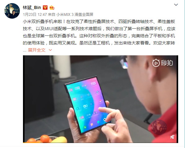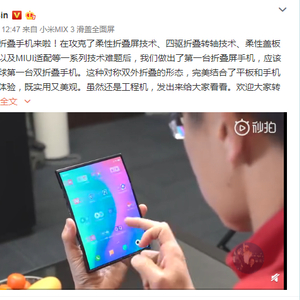 而就在前一天,小米总裁林斌发布了一段小米折叠屏手机工程机的操作视频。从视频中来看,这款手机采用的两侧外向折叠的方式,展开状态下更像是一款平板,可以沿着较长一边两侧对向折叠;折叠后的手机更像是一台手机,左右边缘皆为屏幕,被折叠部分则只呈现背景色。