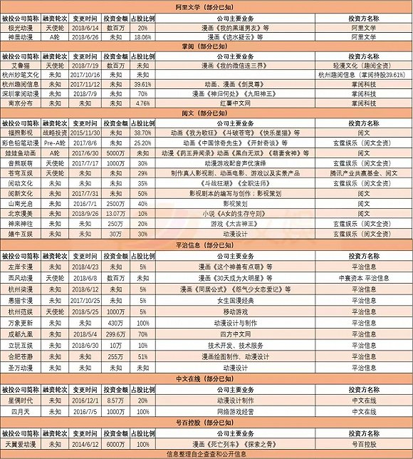 同年8月,三文娱曾统计了阅文、掌阅、平治信息和阿里文学四家公司在动漫领域的投资情况,已知的公司有17家。到了2019年1月,这一数字增长到了28,新增公司11家。