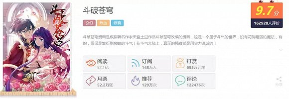 再从漫画平台上看,2018年腾讯动漫月票榜排名前十的作品,有《百炼成神》、《妖道至尊》、《英雄?我早就不当了》三部改编自网文;2018年快看漫画畅销榜排名前十的作品更是有5部由网文改编;而小明太极头部作品《斗破苍穹》、《绝世唐门》、《武动乾坤》亦改编自经典玄幻网文,其中《斗破苍穹》单部漫画已收获了52.1亿次阅读,每话的阅读收费为99元宝(折算人民币0.99元),仅一部漫画的付费阅读就能为平台提供相对出色的营收。