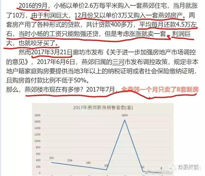 不过小杨不是运气最差的那个,燕郊很多楼盘从3.5万跌到了1.7万,几乎腰斩。朋友圈还有人晒图,首付不要了,还月供就行。