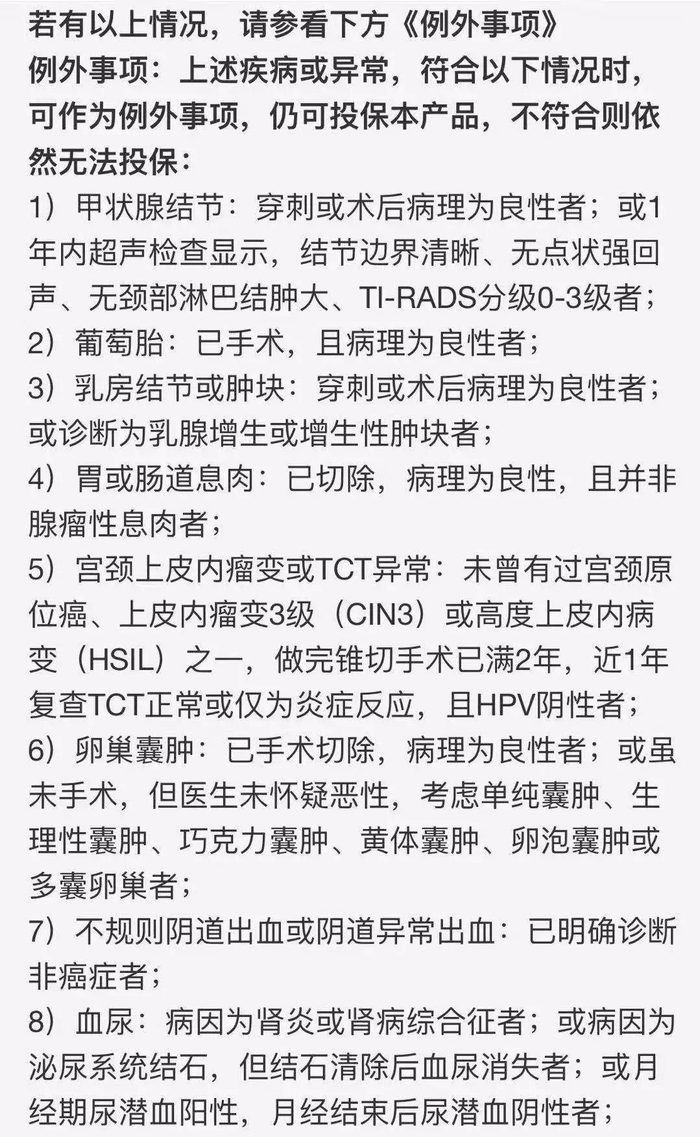 不过,即使不满足上面的健康告知,只要符合下面的例外事项,同样也是可以投保的。
