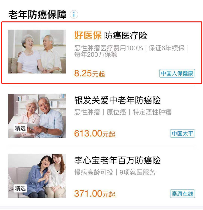 这款产品被放到了老年防癌保障区域。