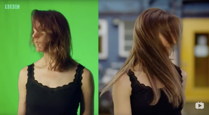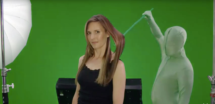 四是“绿幕”技术,在视频广告中需要通过该技术让长发摆脱地心引力。这是目前最常用的影视特效,《星际穿越》《权力的游戏》《阿凡达》中所涉及的特效镜头几乎都是在绿幕中拍摄的。