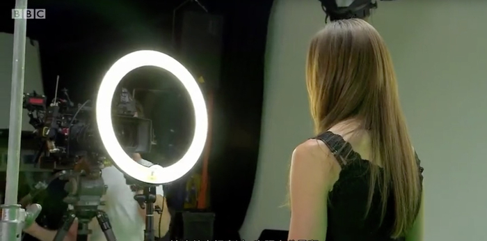 三是“灯光”,除了头顶和两侧的光源,还有一个“环形灯”放在模特正对面,镜头从环形灯中穿过,光线十分柔和,能“隐形”模特面部的皱纹、眼袋等各种瑕疵。此外,有了灯光的照射,也会让模特的眼神变得更加明亮。