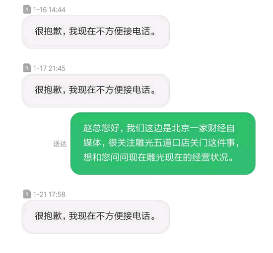 侦探君致电挚信资本李文静,以五道口店关门为由向其了解雕光发展是否面临困境。李文静回应:“这不是雕光现在想要报道的,挚信只是投资方,具体运营要问赵珂僮(即赵栋)。”问及挚信作为大股东对雕光现状的看法时,其回复“不必告知”,关于挚信对雕光发展规划等问题她均表示不方便透露。