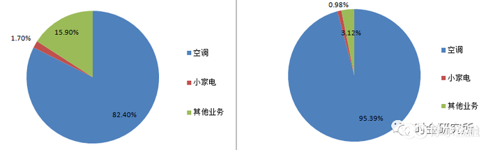 作为格力电器的主营业务,2018年上半年,空调销售占到公司整体营收比例82.4%,小家电占比仅有1.7%,其他业务占比15.9%。如果从公司的毛利来看,空调业务更是占据了格力电器2018年上半年整体毛利的95%以上,可谓是一头独大。