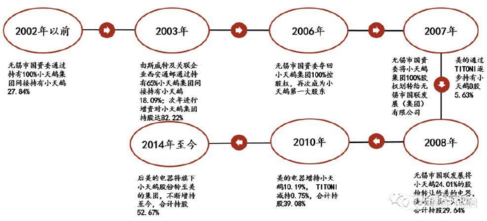 小天鹅的股权结构可谓是一波三折,控股股东从无锡市国资委到斯威特,再回到无锡国资委再到无锡市国联发展集团。最终2008年美的电器持股小天鹅24.01%股份成为其第一大股东,截至目前,美的集团直接或间接持股小天鹅52.67%。
