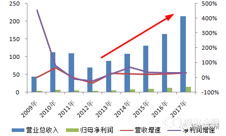 (小天鹅近年来股权结构变动)2008-2017年,十年间,小天鹅股价累计上涨493%。营收从42.93亿元增至213.85亿元,复合增长率达到19.53%;归母净利润从0.4亿元增至15.06亿元,复合增长率49.65%。
