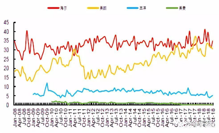 根据产业在线的数据,2018年1-10月洗衣机累计内销市场份额海尔34.82%,美的系30.49%,美的系近来年市场份额提升明显,二者内销出货量可以说已经非常接近。