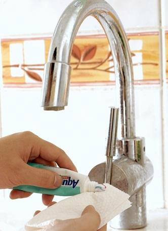 水龙头周围容易积有肥皂液渍和水垢等污物,可以先喷点白醋,然后用抹布用力擦拭,污垢较多的水管处用牙刷反复刷洗,最后将其擦干就会闪亮如新了。