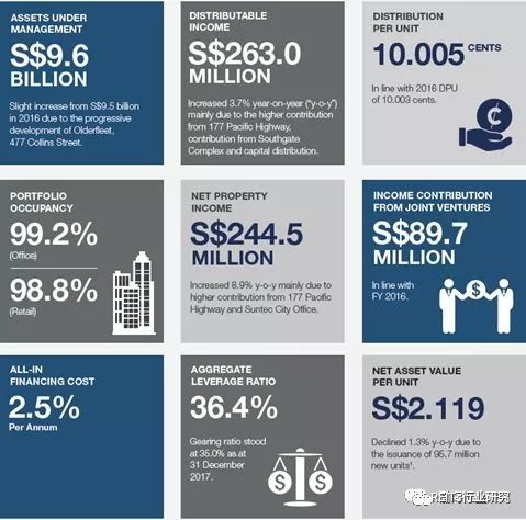 截至2017年底,新达信托管理资产(AUM)为96亿新加坡元。办公室出租率达到99.2%,零售物业出租率达到98.8%。 该信托于2017财年实现总收入3.562亿新加坡元,较2016年同期增加7.8%。 这主要是由于177太平洋公路的租金贡献以及新达城市办事处的贡献增加,部分被零售收入减少所抵消。其中办公室收入为1.757亿新加坡元,同比增长19.1%;零售收入为1.188亿新加坡元,较2016财年下降2.4%。2017财年的净财产收入为2.445亿新加坡元,同比增长8.9%。 这同样是由于177太平洋公路和新达城市政府的贡献,部分被零售贡献减少所抵消。2017财年合资企业的收入贡献为8970万新加坡元,与2016财年的8970万新加坡元相符。新达信托于2017财年实现可分配收入总额2.63亿新加坡元,同比增长3.7%。2017财年的DPU达到10.005美分,这意味着全年的年收益率为4.65%。截至2017财年末,新达信托基金单位持有人的总回报率为238.5%, 成为新加坡最具流动性的上市房地产投资信托基金之一。