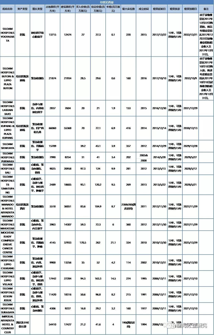 上表中列出了先锋医疗产业信托在亚洲拥有的20处资产,将近13.5亿新元。包括了印尼16家医院、2家综合医院和购物中心、1家综合医院和酒店以及1家酒店和乡村俱乐部,以及新加坡的3家养老院和韩国的1家医院。