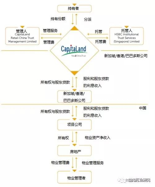 如图所示,CRCT通过它在新加坡和巴巴多斯的子公司间接持有中国境内的多个项目公司并提供相应的股东贷款,进而持有这些项目公司所拥有的物业资产。具体来看,CRCT在中国境内设立外商独资企业(WOFE)或合资企业,并由这些外商企业分别持有不同的标的物业,境外在巴巴多斯设立SPV公司,由SPV持有境内外商企业的股权,再通过CRCT收购SPV公司的股权进而持有中国境内的物业,最终实现上市。