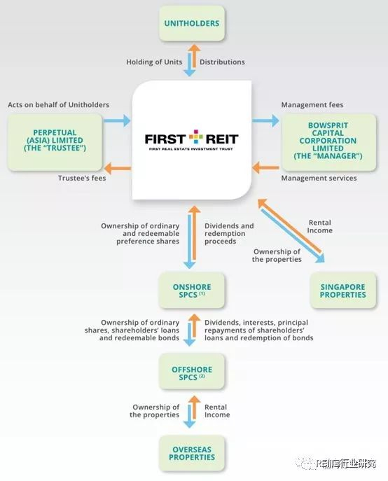 由图中可以看出以先锋医疗产业信托为中心,PERPETUAL(亚洲)有限公司作为托管人,BOWSPRIT资本有限公司作为管理人。并持有新加坡地产的物业所有权,从中获得租赁收入。