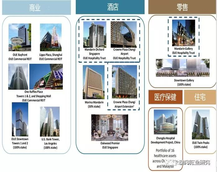 在新加坡证券交易所主板上市的 OUE Limited(SGX-ST:OUE,华联企业有限公司) 是一家多元化的房地产业主、开发商和运营商,其投资的房地产组合位于亚洲和美国的黄金地段,涉及商业、酒店、零售、住宅和健康保健领域。凭借投资以及提升稳定的特色地产组合这一核心战略,OUE 致力于开发拥有强大的经常性收入基础(与开发利润取得平衡)的地产组合,以提升长期股东价值。OUE 是 OUE Hospitality Trust 和 OUE Commercial Real Estate Investment Trust的赞助商。截至2018年6月30日,OUE 通过这两个房地产投资信托基金拥有约57亿新加坡元的资产管理总额。截至2018年6月底,OUE持有的物业情况如下(其中蓝色虚框内为OUE Hospitality Trust的资产组合):