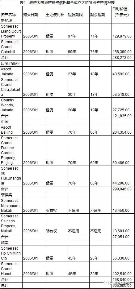 成立之初的资产由分布在新加坡、中国、印度尼西亚、菲律宾和越南5个国家、7个城市的12个物业组成,共2,068套公寓单位,具体如表所示: