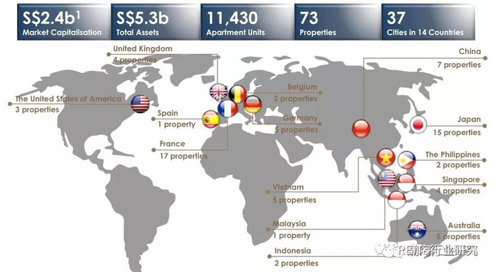 资产覆盖地区由成立之初的亚太地区5个国家、7个城市的12个物业,共2,068套公寓单位,扩展到14个国家、37个城市的73个物业,共计11,430套公寓,管理资产价值由9.05亿新元增加到约53亿新元;