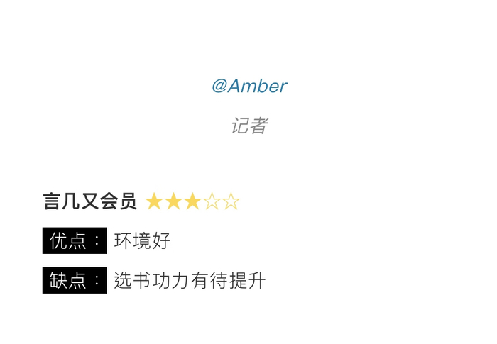 我看中的是书店环境,它没有那么喧哗,像我这样单纯想找个地方看看书还是蛮不错的。其实我对它的会员制不算特别满意,觉得有没有会员没什么区别,特别是不经常来的,就没必要开会员。我也是来了好多次才决定开的,目前我还没有感受到它的活动福利,可以多多关注一下。