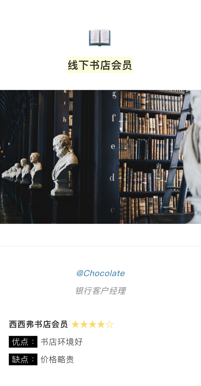 我家楼下开了一个西西弗书店,我每周平均要去3到4次。去多了索性就半个会员卡。它是充值300元就能成为西西弗会员,买书周三88折,咖啡9折,有生日礼包,积分兑换等福利。