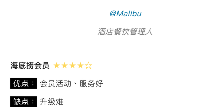 金海以上级别的会员有机会参加海底捞不定期举办的会员活动,还有一些其他的福利,比如说无需等位,或者说在海底捞北京新开的智慧餐厅里,金海以上级别会员可以属于定制自己的“千人千面”锅底。黑海以上的会员还能有“暖心”增值服务,因为还不是“黑海“,这个福利显得有点神秘,考虑到海底捞的服务水平应该是小管家一样的存在吧。