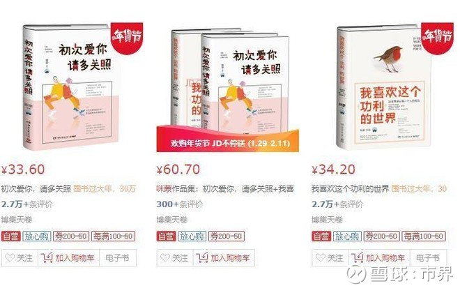 市界在京东商城上发现,咪蒙出版的图书如其公众号内容一样,深受大家欢迎。《初次爱你,请多关照》以及《我喜欢这个“功利”的世界》是近期销量最好的两本书,仅评论就有几万条。据网站销售页介绍,《我喜欢这个“功利”的世界》总销售突破100W册,按34.2元每本计算,仅这一本图书,就带来近3500万元的收入。