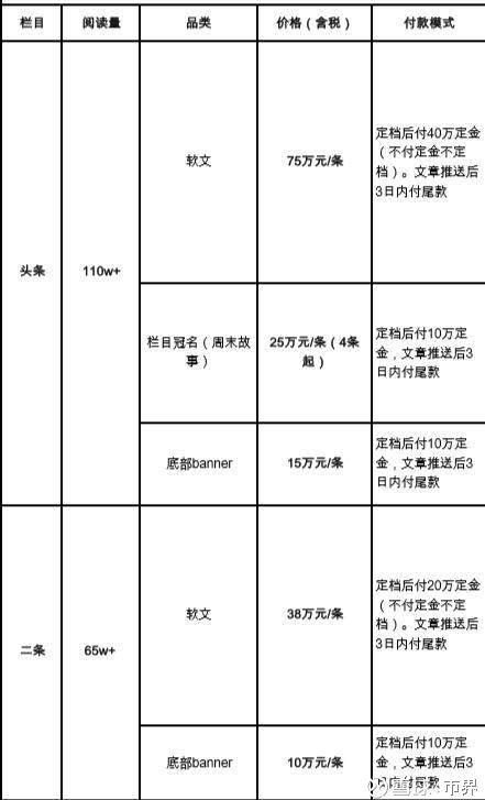 市界得到一份《咪蒙》公众号“2018年”第一季度报价显示,咪蒙共有粉丝1340万,头条软文报价75万元/条,栏目冠名(周末故事)25万元/条(4条起),底部banner15万元/条;二条软文报价38万元/条,底部banner10万元/条。受访的业内人士透露,“或许是为达成长久关系,给公关公司是按9.5折报价。”