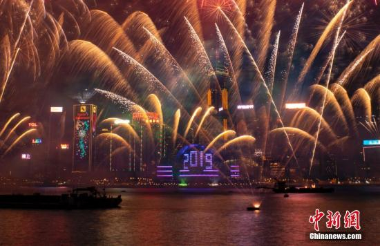 2019年1月1日0时,历时10分钟的“烟火音乐汇演在香港维多利亚港上空正式上演。伴随着悠扬的音乐,璀璨烟花在空中绽放,幻彩光束在空中闪耀,会展中心玻璃幕墙上出现巨型“2019”字样。中新社记者 张炜 摄