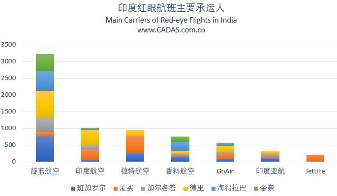 1月28日至2月3日间印度共有11家航司运营红眼航班,其中7家航司周离港频率超过200架次。印度红眼航班承运人中JetLite仅在孟买运营,其余主要承运人均在四个或以上机场设有红眼航班。在印度红眼航班市场上本土低成本航空占据市场主导地位,7个主要承运人均为印度本土承运人,除印度航空、捷特航空外均为低成本航空公司。