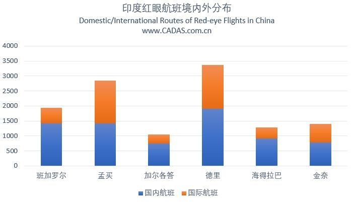 从印度红眼航班境内外航线分布观察,印度机场整体境内外航线比例接近3:2,孟买机场国际航线数量略微高于国内航线,其余机场国内航线占比均大幅超过国际航线。