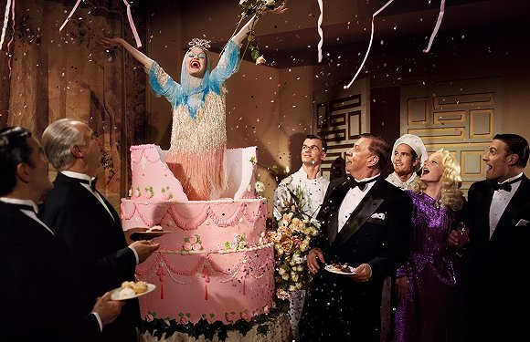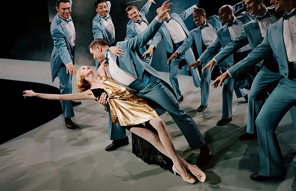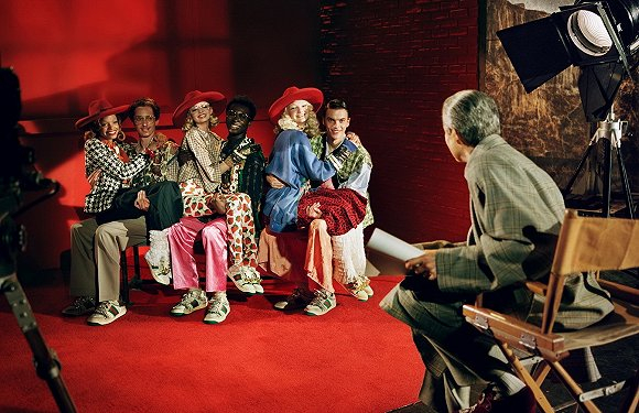 如果熟悉上述影片会发现Gucci的这支广告片中有不少画面都很眼熟。事实上,Luchford正是“改造”了这些电影的最经典镜头,比如有《雨中曲》中女演员从蛋糕中突然钻出惊喜全场的场景,又比如,《绅士爱美人》中一身珠光宝气打扮的女演员被男演员们“众星拱月”的片段。演员的情绪,画面的布景都是相似的,差别主要在于演员的造型——作为广告片,演员们穿的自然是处于宣传期的Gucci 2019春夏系列成衣。