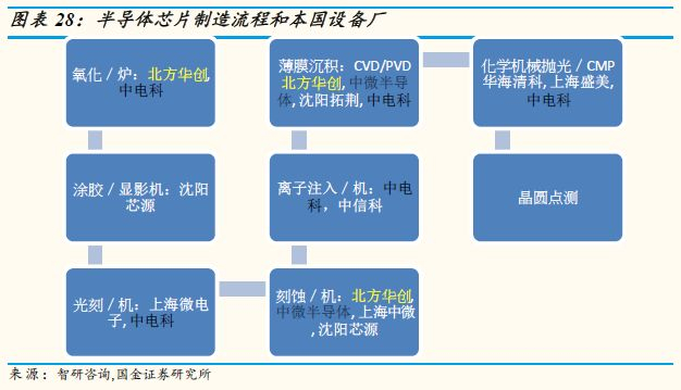 2011年12月発布的《集成电路产业“十二五”发展规划》强调要推进8英寸集成电路设备的产业化进程,支持12英寸集成电路生产设备的研发,加强新设备、新仪器、新材料的开发,形成成套工艺,推动国产装备、仪器、材料在生产线上规模应用。支持刻蚀机、离子注入机、外延炉设备、平坦化设备、自动封装系统等设备的开发应用与产业化。此专项培育了一批国产半导体设备商,其重点工艺和技术领域涵盖光刻机、 物理气相沉积 (Physical Vapor Deposition, PVD)、 化学汽相淀积 (Chemical vapor deposition, CVD)、离子注入机、清洗机、检测设备等。包括北方华创(002371.SZ)、中微半导体、中电科、沈阳拓荆、上海微电子、盛美半导体(ACM Research, ACMR)、华海清科等, 而且以下非关键国产设备已在 28-65纳米12 英寸产线实现批量应用。有望在未来两年内进入产线。由于地理上的优势,国产设备商在与晶圆生产商在合作进行设备的开发和验证上有巨大的便利性,且国产设备在性价比和售后服务上有不错的竞争优势。虽然我们看好中国半导体设备产业未来7年的生产销售复合成长率将达27%,中国半导体设备产业自给率将从2018年的大约14%,提升到2025年的21%左右; 但是现在的全球市场份额仍严重偏低,制造工艺仍落后美、日大厂甚多,所以我们认为中国半导体设备厂商,为了能在弯道超车加速增长,势必持续吸收国际大厂设备人才,拉高研发支出,造成短中期的获利压力。当然目前中国设备厂商为数众多,由政府出资让龙头厂商带头整并,才不会浪费研发资源。