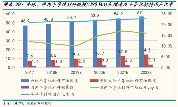 中美贸易摩擦加剧,半导体材料国产化进程有望加速。我国封测产业凭借人力成本竞争力在全球半导体产业链中已经处于优势地位,目前产业发展重心开始向晶圆制造环节转移,而国内各类晶圆制造材料正是与晶圆厂合作开发才得以实现技术领域的突破,所以中游制造和下游封测的崛起对于国内半导体材料的发展具有重要意义。在中美贸易摩擦加剧的背景下,国内晶圆厂和封测厂更愿意尝试采用国产材料,分散供应商全部来自海外的经营风险,可以说贸易战为国产半导体材料提供了一个难得的发展机遇,晶圆制造材料的国产化进程有望加速。