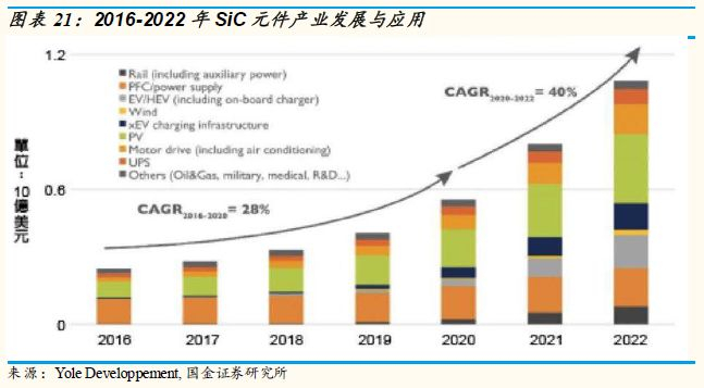 GaN/SiC基MOSFETs将兴起:预测至2022年,SiC元器件的市场规模约10亿美元,2018-2020年CAGR为28%,而2020年之后市场规模加速增长,2020-2022年CAGR达到40%。硅基MOSFETs已经发展了20年,不断的技术进步和发展使得MOSFET器件的体积和成本显著地下降。MOSFETs被广泛使用在各个电子电力相关领域,但是,硅基MOSFETs的性能也逐渐达到了物理极限。为了追求更小的器件体积以及更好的性能,功率器件厂商逐渐推进下一代技术方案的SiC和GaN基MOSFETs。1)SiC基MOSFETs相较于硅基MOSFETs拥有高度稳定的晶体结构,工作温度可达600 ℃;2)SiC的击穿场强是硅的十倍多,因此SiC基MOSFETs阻断电压更高;3)SiC的导通损耗比硅器件小很多,而且随温度变化很小;4)SiC的热导系数几乎是Si材料的2.5倍,饱和电子漂移率是Si的2倍,所以SiC器件能在更高的频率下工作。