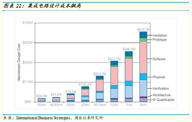 IC设计行业中的大部分企业整体规模较小,但是在产品设计过程中却需要投入大量研发和设计成本, 尤其是构建开发工具、IP核授权、设计验证,结构设计, 软体设计, 和最后的确认, 从International Business Strategies的数据来看, 從14/16纳米to 5纳米, 設計成本將增加接近三倍, 但由于前期研发投入大,企业研制的芯片产品盈亏平衡点较高, 市场销售规模通常要达到上百万颗, 才能确保盈利。若产品不能符合市场的需求或销售规模有限, 巨额研发费用的投入将无法收回, 企业将面临损失。这就是为什么我们认为, 中国1500家设计公司, 数量过多, 研发资源分散, 政府应该投资龙头厂商或有优势经营团队的设计公司, 由其带头整并中小型具有智财权的设计厂商。
