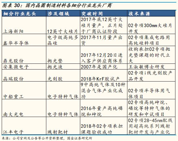 由于半导体材料作为支撑整个产业做大做强的基础,国家在“十二五”02科技重大专项即极大规模集成电路制造装备与成套工艺专项中对于半导体材料国产化进行了提前布局,近两年各类半导体材料实现了技术突破的第一步。国产大硅片龙头新昇半导体在2017年底实现300mm(12英寸)大硅片量产发货,溅射靶材龙头江丰电子已经在在16纳米技术节点实现批量供货,同时还满足了国内厂商28纳米技术节点的量产需求,鼎龙股份收购了国内唯一一家掌握抛光垫大规模生产能力的企业时代立夫后,现在抛光垫已经在2017年底进入客户认证阶段。在技术壁垒极高的光刻胶领域,北京科华得到02专项的资助后,预计在2020年可以实现主流的193nmArF光刻胶的全面量产。实现技术突破之后,国内晶圆厂的快速发展为这些企业提供了很好的发展机遇,未来行业优质标的值得关注。