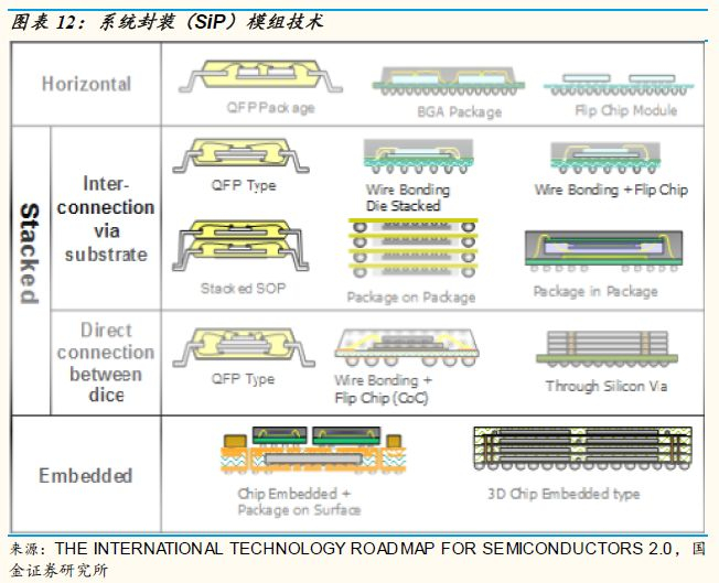 随着电子产品进一步向小型化和多功能化发展, 因为芯片尺寸越来越小, 芯片种类越来越多, 输出入脚数大幅增加, 3D封装, 硅穿孔 (TSV, Through Silicon Via), 扇形封装 (Fan-out wafer level packaging), 晶圆封装细间距键合 (Wafer on wafer fine-pitch bonding),系统封装 (System in packaging) 技术的发展成为继续延续摩尔定律的最佳选择。其中3D封装技术是把不同功能的芯片,通过堆叠技术,使其形成立体集成和信号连通的三维立体封装技术。TSV是通过在芯片和芯片之间、晶圆和晶圆之间制作垂直导通,实现芯片之间互连的最新技术。与以往IC封装键合和使用凸点的叠加技术不同,3D封装技术能够使芯片在三维的密度增加,外形尺寸減少,大大改善芯片速度和低功耗的性能。为了跟上摩尔定律的步伐,在高速芯片的设计和生产过程中采用三维封装技术将会成为必然。扇出晶圆级封装(Fan-Out WLP)技术是先将芯片作切割分离,然后先将芯片正面朝上黏于晶圆载具(Carrier substrate)上,并且芯片间距要符合电路设计之节距(Pitch)规格,接者进行封胶(Molding)。后续将封胶面板与载具作分离,因为封胶面板为晶圆形状,又称重新建构晶圆(Reconstituted Wafer),可大量应用标准晶圆制程,在封胶面板上形成所需要的电路图案和锡球。由于封胶面板的面积比芯片大,可将I/O接点散出(Fan-Out)方式制作于塑胶模上,如此便可容纳更多的I/O接点数目。 由于Apple Watch, 指纹辨识感测器, 3D脸部辨识感测器, WiFi无线网路都是利用日月光的系统封装(SiP)模组技术,成功地将集成电路,分立器件, 光学器件, 记忆体, 多层陶瓷电容器, 片形电阻器整合到轻薄短小的基板, 而其信息不会互相干扰,我们认为苹果在系统封装的应用上至少领先竞争者一到两年。