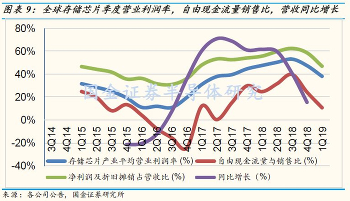 但英特尔14纳米x86 CPU良率欠佳造成的产能短缺,客户清理内, 闪存(DRAM/NAND)的高价库存,虚拟货币崩跌,苹果于11月初下修其iPhone智慧手机产业链订单近30%,以及3D NAND转到96层及DRAM转到1Y纳米制程工艺的产能增加等综合作用,我们国金证券研究所因此预估2019年全球半导体产业规模同比会衰退2%到4,684亿美元,其中存储芯片产品占比约为32%,但预期同比销售额衰退幅度将达到8-12%(今年同比增长33%),主要是因为我们预估未来三个季度仍供过于求,价格及产业下行趋势确立。自美光预期明年第一季度销售环比衰退20-28%,同比衰退14-22%(低于第四季度的16%同比成长),低于市场预期近17-18%的差异下,美光下调其资本支出从105亿美元到90-95亿美元,并且下砍2019年的DRAM需求同比位元增长(bit growth)从20%到15%,NAND需求同比位元增长从40%到35%。我们的预估未来三个季度,每个季度内存DRAM环比位元价格(bit price)将下跌5-10%,每个季度闪存NAND环比位元价格(bit price)将下跌10-15%,美光及其他大厂营业利润率将下探20%以下。我们的预估是比存储器产业研究机构DRAMeXchange对明年存储器芯片产业5%的销售同比增长预估(DRAM 7% 同比增长,NAND同比零成长)及WSTS (World Semiconductor Trade Statistics)预估的无衰退(同比衰退0.4%)来的悲观许多。就光以1Q09营收而言,美光就直接步入同比衰退近18%, 其他存储芯片大厂如何置身事外呢?