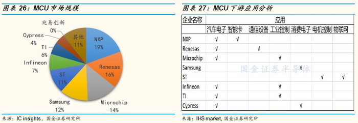 物联网急速带动MCU成长:MCU的市场规模:2018年MCU的市场规模达到186亿美金,同比增长11%;出货量将达306亿颗,同比增长率为18%,预测在未来五年内MCU的出货量的复合增长率为11.1%,市场规模的复合增长率达7.2%。MCU的下游应用与发展驱动力:汽车目前约占整体应用30%,市场规模约为60亿美金,而且增速是所有领域最快的,预计未来5年CAGR可达10%。在汽车领域,MCU主要用于控制系统、多媒体系统、辅助驾驶系统等。工业领域是MCU第二大应用领域,约占整体营收25%左右,未来MCU在工业领域应用主要受益于工业自动化+联网化。受益于下游物联网的市场规模的不断增加,MCU的出货量将持续增长。预计到2030年全球物联网设备基数将达到1000亿台,相对于2015年的154.1亿台,复合增长率为13.3%。目前MCU市场主要为国外厂商占领,前七家厂商共占领超过70%市场份额。其中NXP、瑞萨等公司主要应用领域均涉及高端汽车领域。车规芯片的可靠程度是各大车厂极为重视的。一般车规芯片的验证周期至少需要两年以上。车规芯片一般要求环境工作温度从-40℃~105℃,而芯片实际工作温度(junction temperature)是从-40℃~125℃。工作寿命长。一般消费电子元器件的寿命只有几年,而车规级别元器件的寿命要十年以上。例如ST公司的spc5 系列芯片产品寿命达到15年。中国厂商由于技术差距,目前暂时没有进入汽车领域。国内龙头兆易创新市占率不超过0.2%,过去3年复合增长率超过50%,目前已经布局低功耗、蓝牙等功能产品,有望通过产品性能的提升与后续配套服务的晚上,持续提升市场份额。