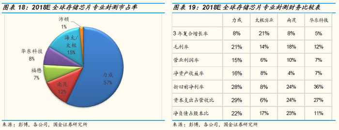 专业封装厂大不同:因为逻辑和存储芯片在封装数量,样式,脚数,技术,生产设备配置的大不同,例如日月光 (3711 TT)、台积电封装部门(2330 TT)、安靠 (AMKR US)、长电科技 (600584.SH)、通富微电(002156.SZ)、华天科技(002185.SZ)和晶方科技(603005.SH)专攻逻辑芯片封装业务而大多欠缺存储芯片封装业务。但反之亦然,存储芯片大厂自己的封装部门,台湾的力成(6239 TT)、南茂 (8150 TT)、华东科技、中国大陆的太极实业(600667.SH)持有的海太/太极半导体、深科技(000021.SZ)的沛顿(2015年9月30日100%被深科技买下)及紫光宏茂(紫光国微持有48%,南茂持有45.02%,员工及供应商持有6.98%)目前专注于存储芯片封装,闪存存储卡,及各种内存模组的制造,而这些公司逻辑芯片封装业务比重都不高过10%。除三星以外,其他几家存储大厂都把封测业务外包出去但都与其产业链有紧密的合作,例如全球存储封测龙头台湾力成科技主要是透过其大股东美国存储器模块大厂金士顿(Kingston)为东芝和美光提供封测服务,再将成品回售到金士顿,而国内封测龙头太极实业则是通过合资方式成立海太半导体,成为SK海力士在中国的重要内存DRAM封测伙伴,深科技的沛顿是美光在中国的主要DRAM 内存及NAND闪存封装测试厂,当初沛顿也曾经是金士顿100%投资的, 但不同于SK海力士与太极实业的合资伙伴关系,美光除了在今年10月在台中中科后里园区投资16亿美金投资先进封测厂外,与力成,南茂,紫光宏茂,华东科技,沛顿等多家存储器委外封测厂都有合作关系,相对于太极实业与SK海力士的关系而言,沛顿能分到美光存储器的封测份额就相当有限(估计连5%份额都没有)。这就是为什么沛顿的净利润率虽然超过20%,但其存储芯片封测销售额连海太加太极半导体的1/10都不到。