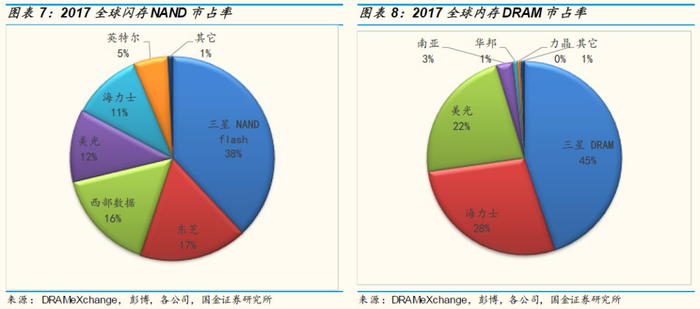 存储产品按照应用类别主要分为DRAM(内存)和NAND Flash(闪存)两种,其下游应用包括数据服务器市场和PC、智能手机等各类消费电子产品领域。虽然逻辑半导体行业的产业链分工成为趋势,即分为Fabless芯片设计厂,晶圆代工厂和封装测试厂商三个环节,但是在存储芯片领域,设计和晶圆制造整合的IDM(Integrated Device Manufacturer)模式还是主要的业务模式。存储芯片领域目前呈现明显的寡头垄断格局,三星,SK海力士,东芝,西部数据和美光是行业的主要玩家。