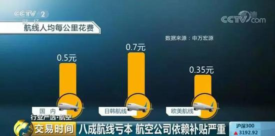 记者了解到,我国大型航空公司日均航班在2000至3000班,其中国际航线在300班左右,航空公司众多航线中,七成左右亏钱,其中欧洲、美洲、澳洲等国际航线几乎是全线亏损,只有飞日本和韩国的航线盈利。根据申万宏源测算,国内航线人均每公里花费是0.5元,日韩航线则在0.7元,而欧美航线仅0.35元。