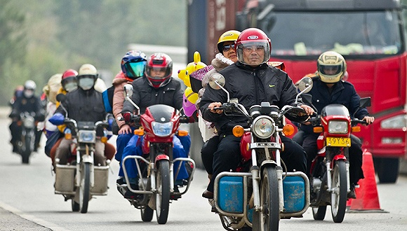 1月26日早上,在佛山市高明区工作的周胜光,带着妻子与弟弟一家结伴骑行回家。这是他第四年骑摩托车返乡。“所有的路我都记得。”