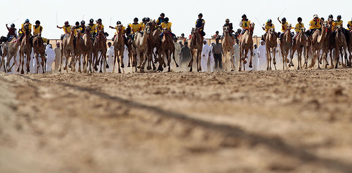 骆驼整齐地排列在起跑线上。
