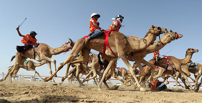 骑师驾驭着骆驼参加竞速赛。