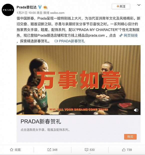 1月21日,Prada官方账号在新浪微博上线品牌为新春系列拍摄的广告,在庆祝新禧同时也为当代亚洲青年文化喝彩。