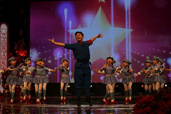 黄豆豆和小朋友一起表演《闪闪的红星》。