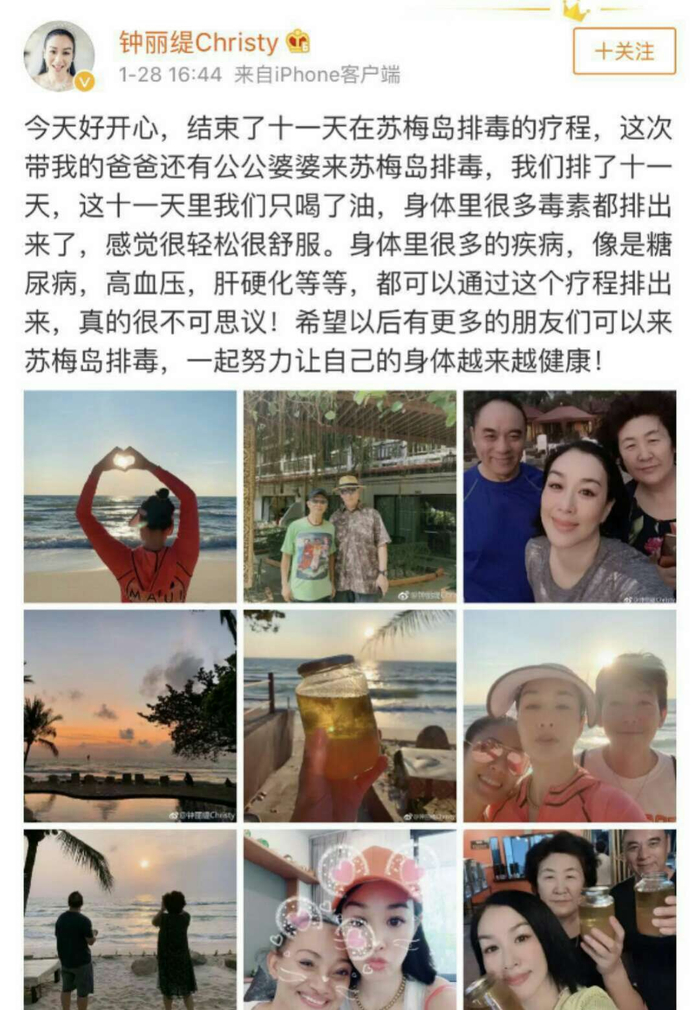 近日,影星钟丽缇在微博自称带爸爸、公婆到苏梅岛进行11天排毒疗程,其间只喝椰子油。其称:“这十一天里我们只喝了油,身体里很多毒素都排出来了,感觉很轻松很舒服。身体里很多的疾病,像是糖尿病,高血压,肝硬化等等,都可以通过这个疗程排出来,真的很不可思议!”,并鼓励更多人前往苏梅岛排毒,引发争议。
