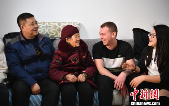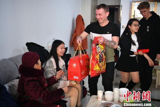 “洋女婿”Liam McCarthy给家中老人拜年并送上新年礼包。 刘忠俊 摄